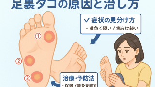 Care-Plaza Blog 足裏タコの場所や原因を徹底解説|症状の見分け方と治し方・予防法までわかる 「足裏にできるタコが痛い…」「市販クリームを塗ってもなかなか改善しない」「同じ場所に何度もできて困っている」――そんな悩みを感じていませんか?実は、足裏のタコができやすい場所には明確な傾向があり、医療現場の調査では【親指のつけ根】【小指の外... 2025.06.30 Care-Plaza Blog